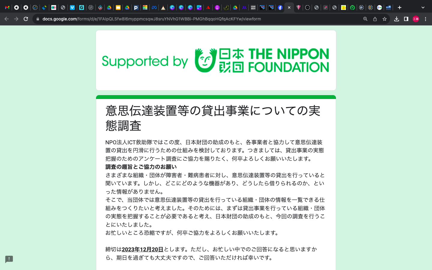 【調査の趣旨】さまざまな組織・団体が障害者・難病患者に対し、意思伝達装置等の貸出を行っていると聞いています。しかし、どこにどのような機器があり、どうしたら借りられるのか、といった情報がありません。そこで、当団体では意思伝達装置等の貸出を行っている組織・団体の情報を一覧できる仕組みをつくりたいと考えました。そのためには、まずは貸出事業を行っている組織・団体の実態を把握することが必要であると考え、日本財団の助成のもと、今回の調査を行うことにいたしました。お忙しいところ恐縮ですが、何卒ご協力をよろしくお願いいたします。